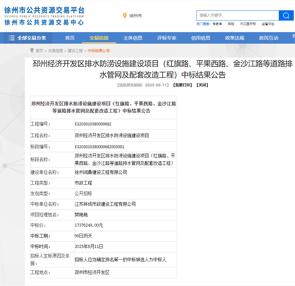 8月11日,我公司喜中邳州经济开发区排水防涝设施建设项目,中标金额1737余万元。